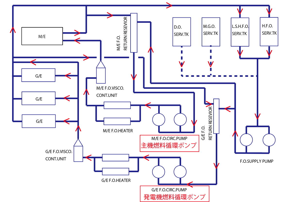 この中で中央下に有るように主機用として燃料を循環し必要量を供給している。